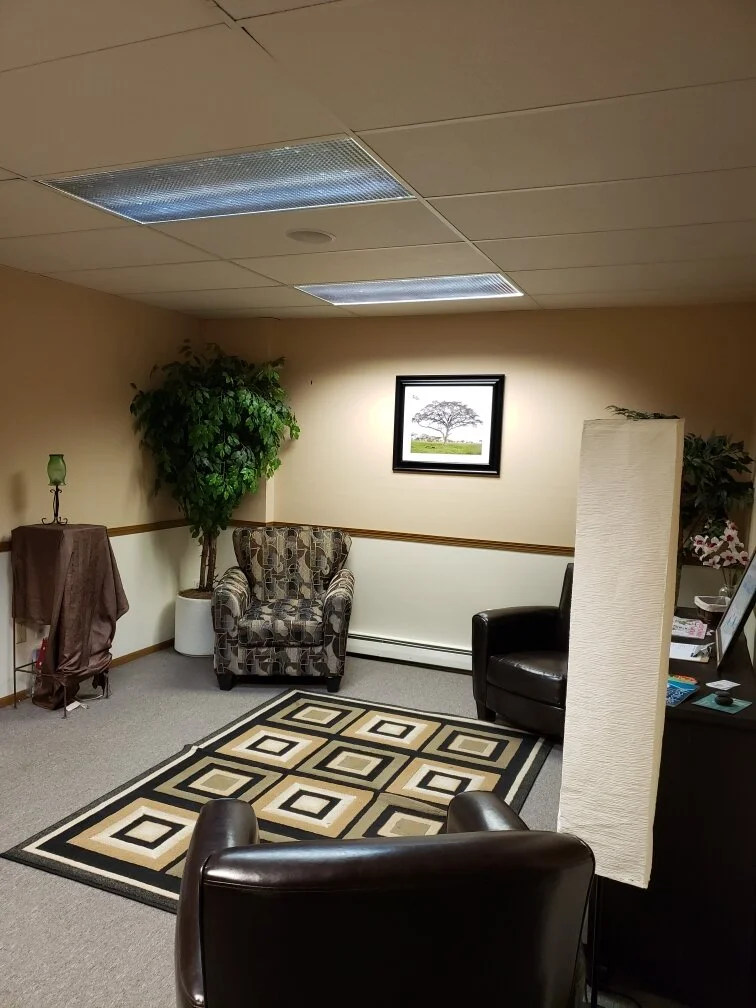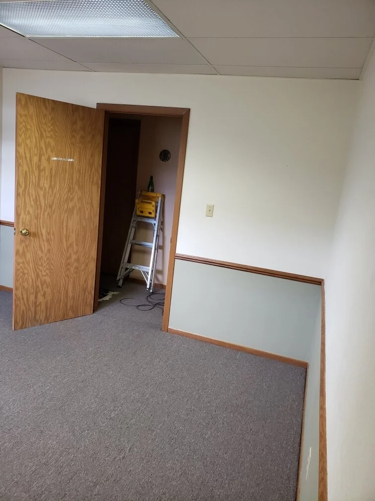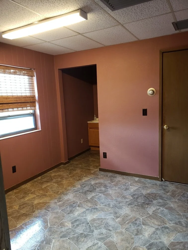 Single room suite with closet space. Shared waiting area (pictured) and shared sink/break area with two other suites. Water and heat included. No CAM charges.